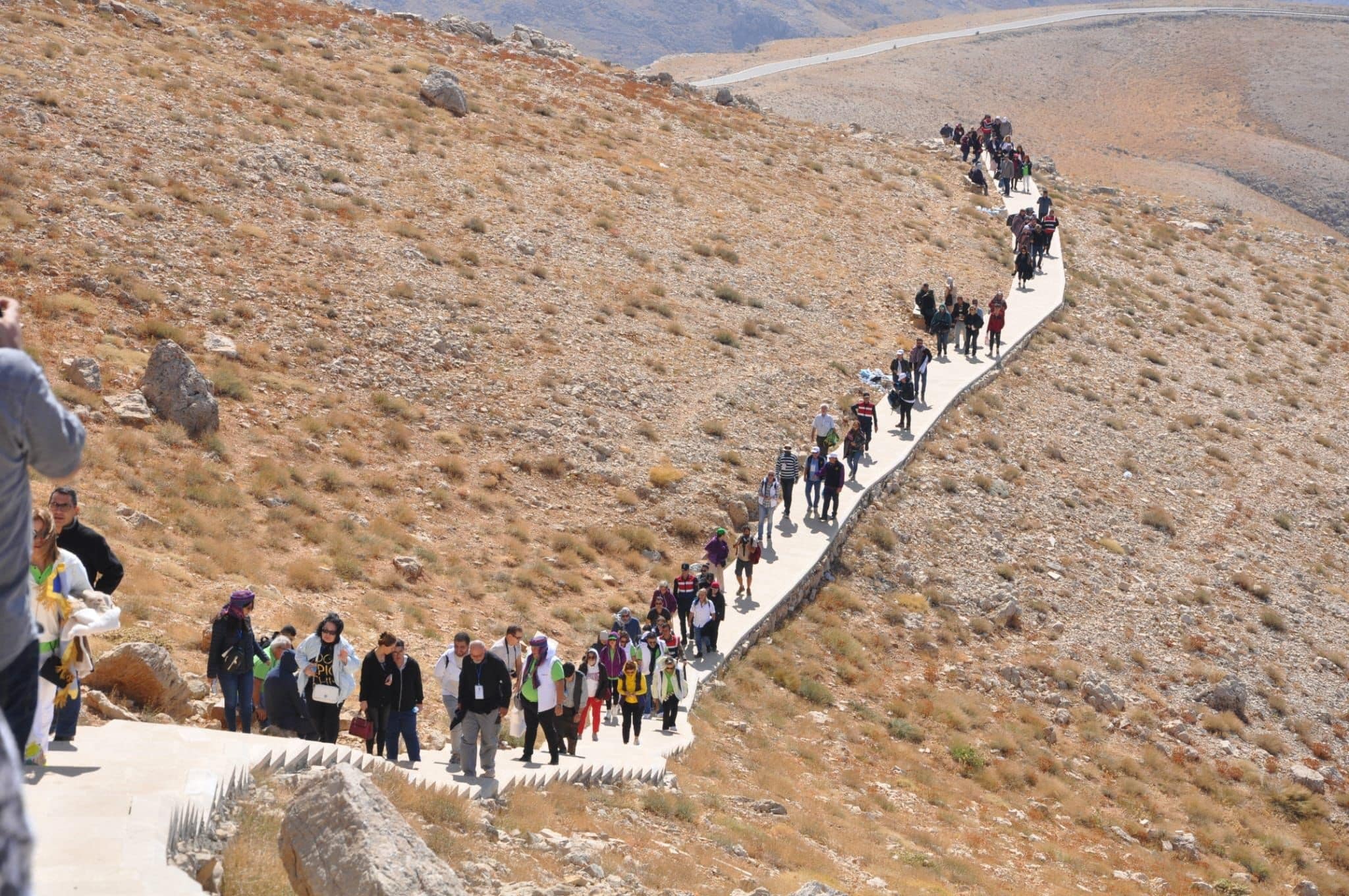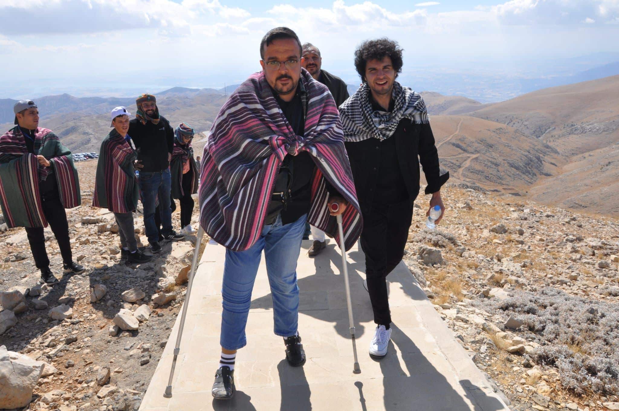 Commagene uygarlığına ait ören yerlerinden Karakuş tümülüsü ve Roma dönemine ait tarihi cendere köprüsünü ziyaret eden engelliler Mehmetçik, rotaryenler ve gençlerin yardım ile zorlu bir tırmanışın ardından Nemrut dağının zirvesine tırmandı.