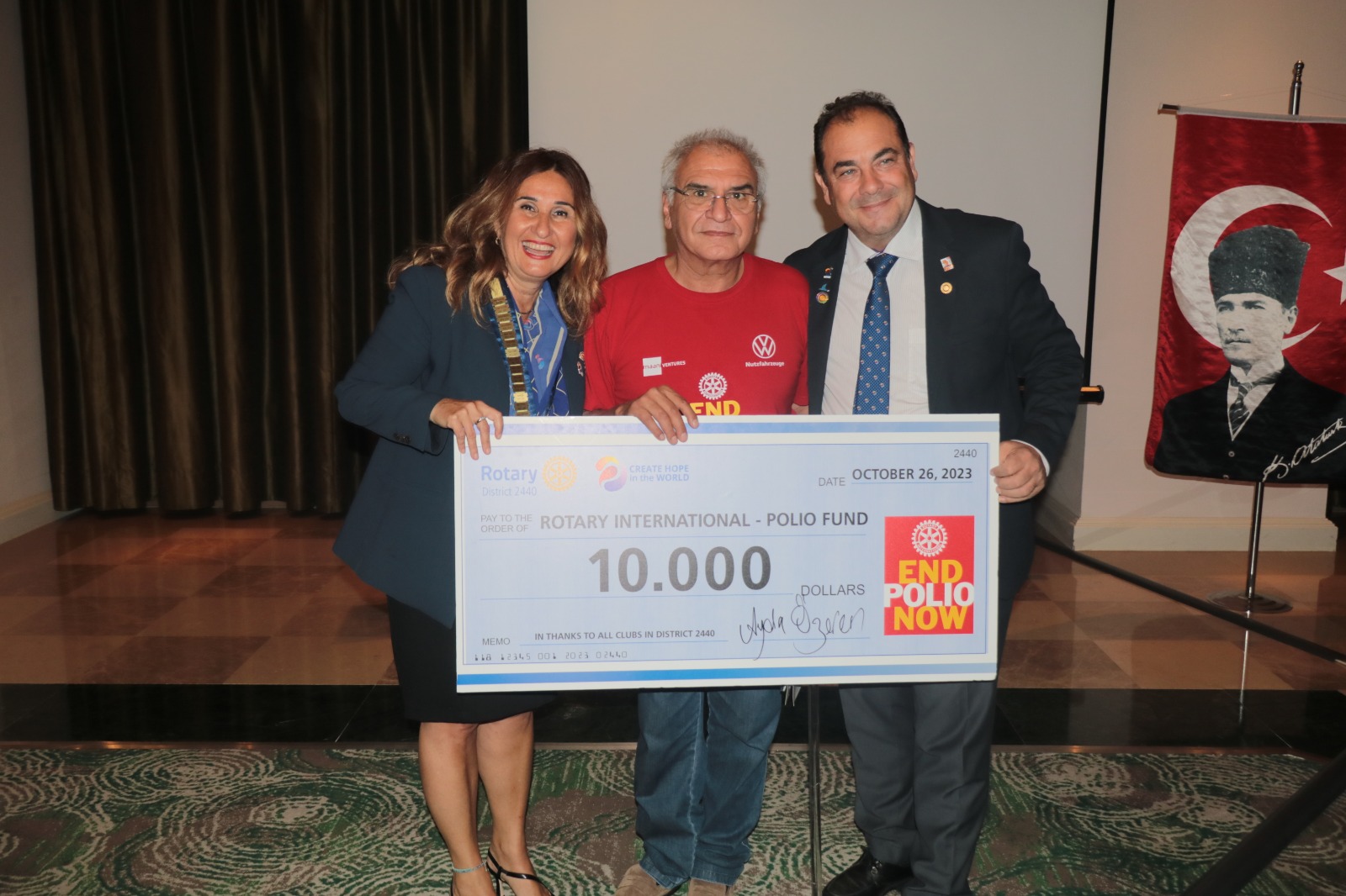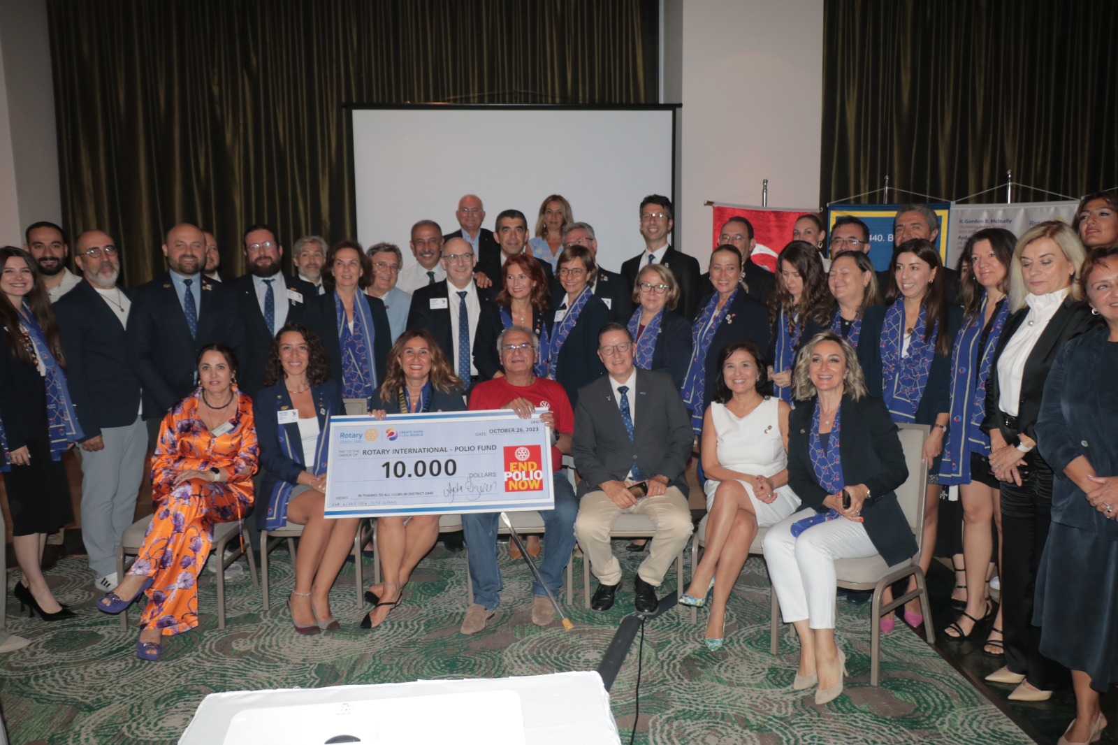 Uluslararası Rotary 2440. Bölge Federasyonu, çocuk felcinden sağ kurtulan ve çocuk felcine dikkat çekmek için Avrupa’da 16 ülkeyi kapsayan farkındalık ve destek turu kapsamında İzmir’e gelen Rotaryen Bashar Asfour’u ağırladı. Rotary 2440. Bölge Federasyonu Kulüpleri tarafından toplanan 10 bin dolarlık bağış çeki Cumhuriyet Meydanı’nda düzenlenen bir etkinlikle Bashar Asfour’a takdim edilirken, Wyndham Grand Otel’de düzenlenen bir yemekte Asfour ve Rotaryenler bir araya geldi. 10 bin dolarlık bağış 210 bin çocuğa aşı olurken, yemekte magnet satışları ile de rotaryenler 860 çocuğun daha aşı olmasını sağlayacaklar.