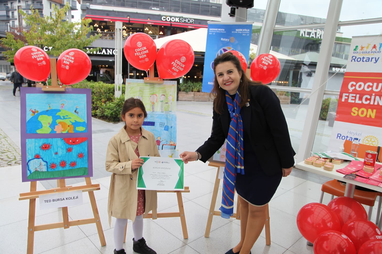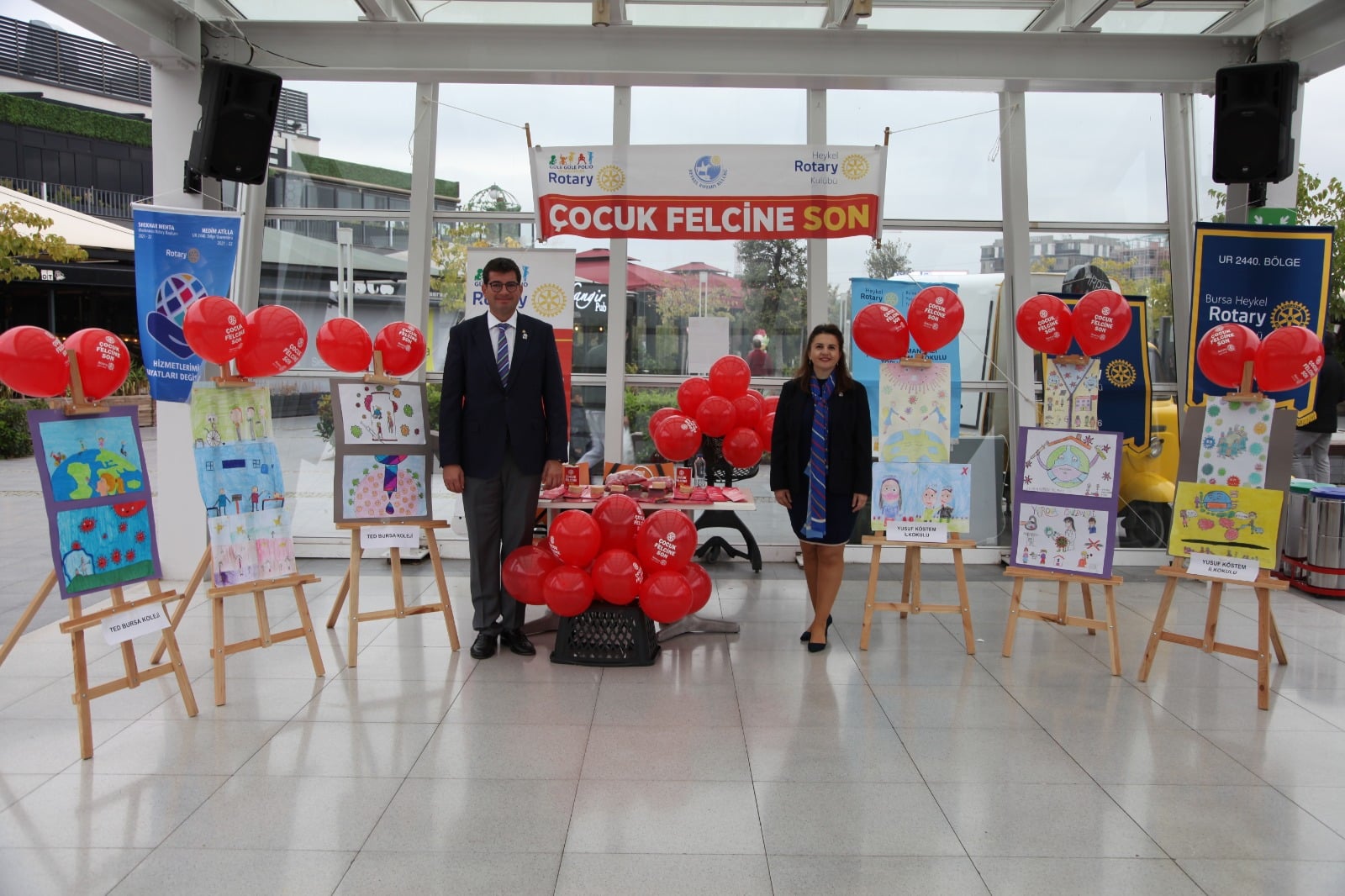 24 Ekim Çocuk Felci ile Mücadele Günü’nü Yeşil Rotary Kulübü’nün de desteğiyle düzenlediği ilkokullar arası resim yarışmasında dereceye giren resimlerin sergilenmesiyle kutlayan Heykel Rotary Kulübü, bu yıl üçüncüsü düzenlenen etkinlikte çocuk felci hastalığını aşı konusundaki duyarlılığa dikkat çeken çocukların resimleri ile anlattı. Kulüp Başkanı Mevlüde Sezer, halka açık alanda yapılan sergide hastalığı anlatan broşür ve balon dağıtarak etkinlik boyunca yanlarında olan Yeşil Rotary Kulübü’ne ve emeği geçen tüm üyelere teşekkür etti.